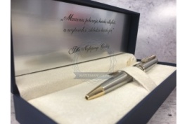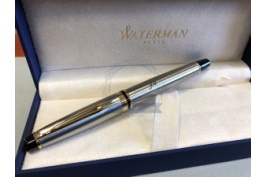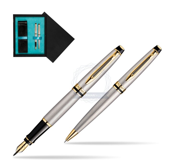 We offer to You Waterman special gift box which contains Waterman Expert Stainless Steel GT Fountain pen + Waterman Expert Stainless Steel GT Ballpoint Pe. Expert brings smart Parisian styling to your business day. With its generous cigar-shaped silhouette and wealth of fine materials, it reveals that beneath your executive persona stirs a creative spirit. Let your vision and flair shine in your professional life with classic Waterman panache. Clients and colleagues will know you by your taste for sophistication. Assertive lines lend a traditional feel to this contemporary classic. The collection features a generous choice of colours and finishes including rich deep lacquers and fine engraving. Brushed steel, golden trims... the alchemist's art allies these metals to create an accessory both contemporary and sophisticated. Its smooth curves add suppleness to your handwriting. As generous as it is sophisticated, this finely gold plated stainless steel nib is adorned with the emblematic W for Waterman. Set is ideal as a gift for everyone on all kinds of occasions like birthdays or as a Waterman Christmas gift. This set is perfect for all companies who wants to give Waterman gifts for their employees, partners or investors. Waterman Ballpoint Pen can be refilled with every Waterman Ballpoint refill and Fountain Pen can be refilled with Waterman Ink in bottle or Ink cartridges. This Waterman Ballpoint Pen comes with a Ballpoint refill is in random colour Black or blue and blue Fountain Pen Ink cartridge. Presented in its Waterman special gift box designed for two Waterman products.