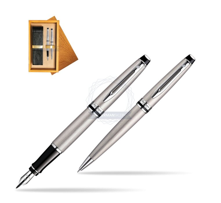 We offer to You Waterman special gift box which contains Waterman Expert Stainless Steel CT Fountain pen + Waterman Expert Stainless Steel CT Ballpoint Pen. Expert brings smart Parisian styling to your business day. With its generous cigar-shaped silhouette and wealth of fine materials, it reveals that beneath your executive persona stirs a creative spirit. Let your vision and flair shine in your professional life with classic Waterman panache. Clients and colleagues will know you by your taste for sophistication. Assertive lines lend a traditional feel to this contemporary classic. The collection features a generous choice of colours and finishes including rich deep lacquers and fine engraving. When raw metal becomes precious. In brushed steel, with sparkling palladium-plated trim, it deals wittily in contrasts while celebrating contemporary chic. Made in stainless steel, its nib is both generous and sophisticated. It proudly bears a majestic W, your guarantee of quality and creativity. Set is ideal as a gift for everyone on all kinds of occasions like birthdays or as a Waterman Christmas gift. This set is perfect for all companies who wants to give Waterman gifts for their employees, partners or investors. Waterman Ballpoint Pen can be refilled with every Waterman Ballpoint refill and Fountain Pen can be refilled with Waterman Ink in bottle or Ink cartridges. This Waterman Ballpoint Pen comes with a Ballpoint refill is in random colour Black or blue and blue Fountain Pen Ink cartridge. Presented in its Waterman special gift box designed for two Waterman products.