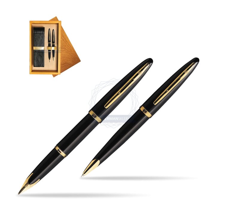 We offer to You Waterman special gift box which contains Waterman Carène Black Sea GT Fountain pen + Waterman Carène Black Sea GT Ballpoint Pen. Carène rides the crest of the innovation wave. Taking inspiration from luxury boat design, the result is our most distinguished example of pioneering vision. Crafted in noble materials, with an artist’s attention to detail, its pure fluid curves conjure up the sleekest lines of a leisure cruiser, or the billowing sails of a luxury yacht. Set sail for the adventure of a lifetime. The streamlined silhouette reflects a determination to achieve absolute purity, notably in the sublimely integrated nib of the fountain pen version. A striking combination of high-gloss black lacquer and rich 24K golden trims produces the classic expression of refined sophistication. Like a plunging bow navigating the infinite possibilities of a pure white page, this rhodium-plated 18K solid gold nib is a unique WATERMAN design. Set is ideal as a gift for everyone on all kinds of occasions like birthdays or as a Waterman Christmas gift. This set is perfect for all companies who wants to give Waterman gifts for their employees, partners or investors. Waterman Ballpoint Pen can be refilled with every Waterman Ballpoint refill and Fountain Pen can be refilled with Waterman Ink in bottle or Ink cartridges. This Waterman Ballpoint Pen comes with a Ballpoint refill is in random colour Black or blue and blue Fountain Pen Ink cartridge. Presented in its Waterman special gift box designed for two Waterman products.