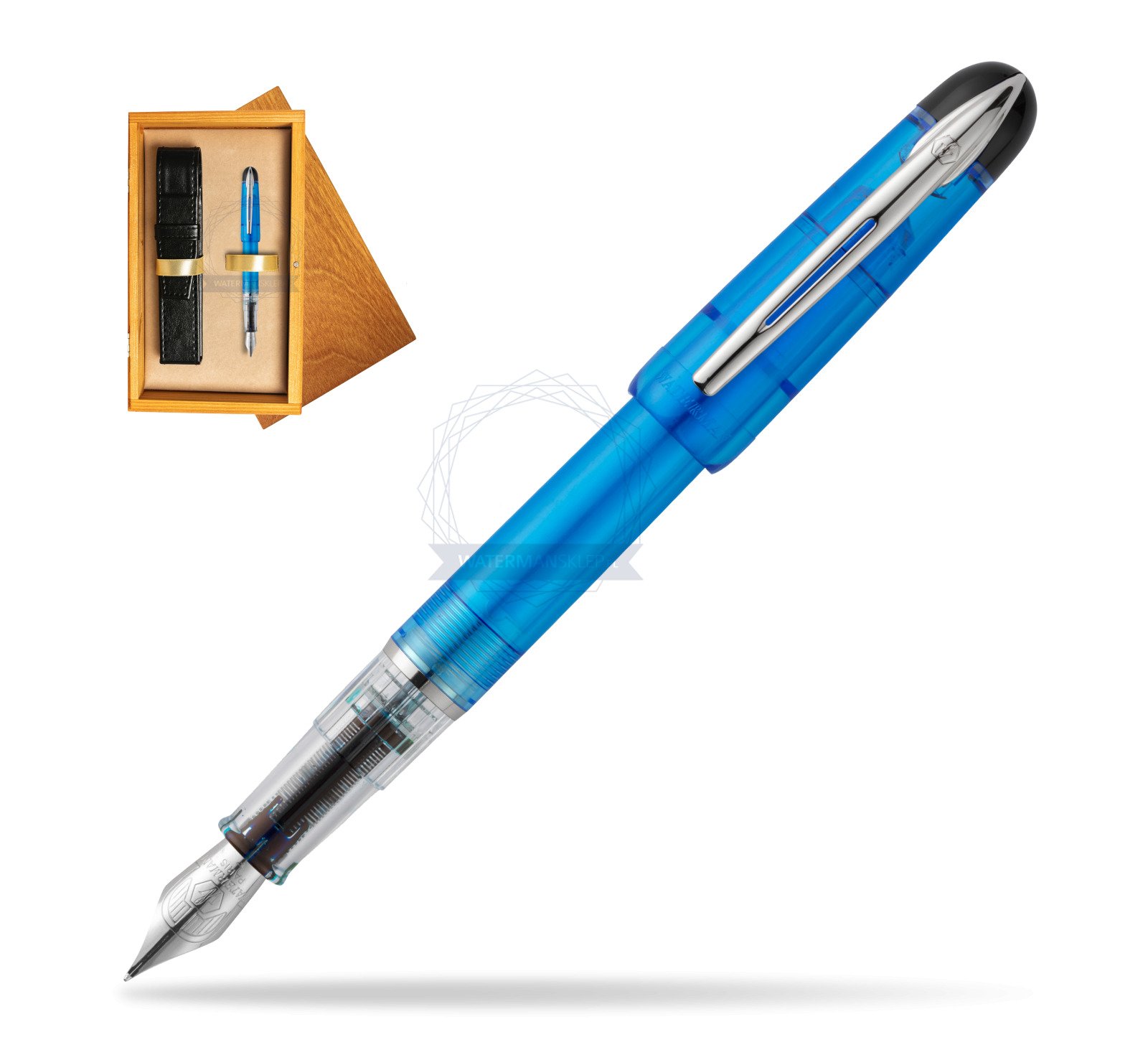 A very interesting fountain pen from the Waterman brand known for its quality. Extremely light, perfect for learning to write, taking daily notes. Translucent, intense blue color of the varnish emphasizes the character of the pen.