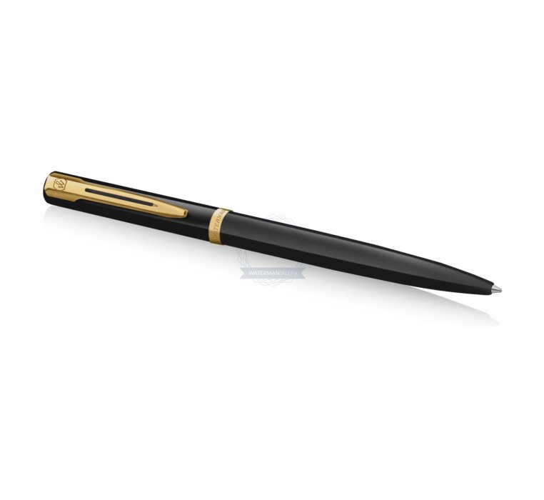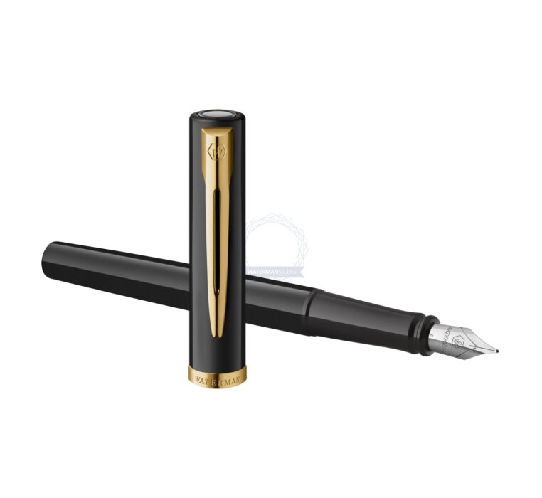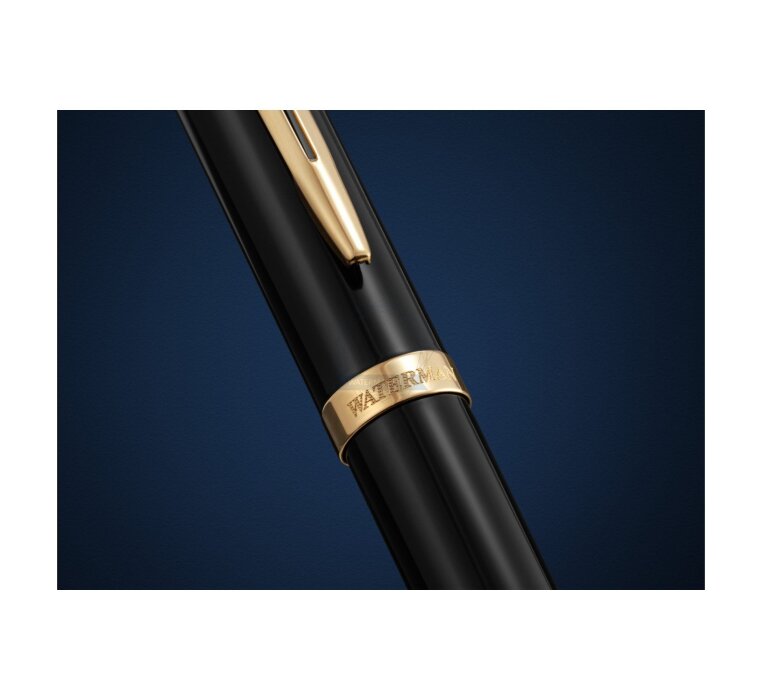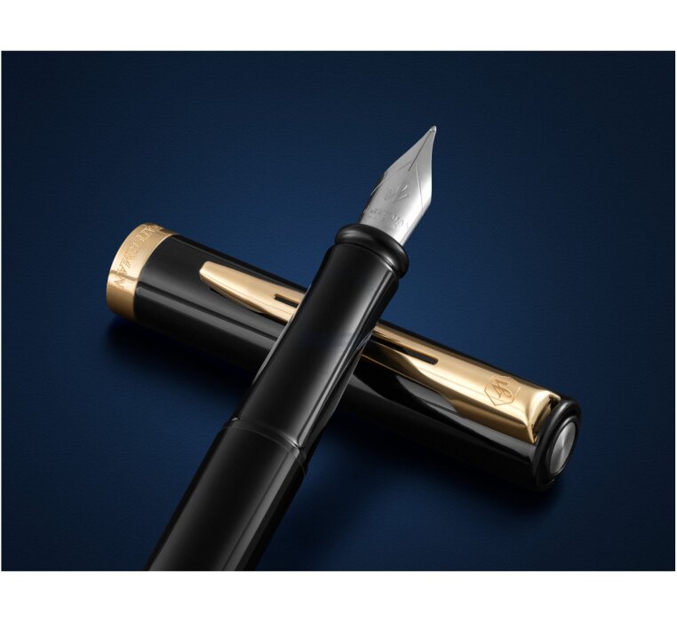 Eine elegante Silhouette, bei der Schaft und Kappe mit glänzendem schwarzen Lack veredelt sind. Der für Waterman charakteristische, zweigeteilte Clip und ein breiter, vergoldeter Kappenring runden das Design mit raffinierter Anmut ab. Die Edelstahlfeder, verziert mit dem gravierten ikonischen Waterman „W“, bietet Geschmeidigkeit und Flüssigkeit und garantiert Komfort und Präzision beim täglichen Schreiben. Das perfekt ausbalancierte Impression-Modell wurde entwickelt, um dem Benutzer Komfort zu garantieren und Vertrauen zu wecken, sobald man es in die Hand nimmt. Jedes Impression-Modell wird in Frankreich von Hand montiert und verkörpert 140 Jahre Waterman-Handwerkskunst und die Tradition des Selbstausdrucks im besten Stil. Eine elegante Silhouette, bei der Schaft und Kappe mit glänzendem schwarzen Lack veredelt sind. Der für Waterman charakteristische, zweigeteilte Clip und ein breiter, vergoldeter Kappenring runden das Design mit raffinierter Anmut ab. Der Füllfederhalter ist sowohl mit Patronen als auch mit Konverter und Tintenfass kompatibel.