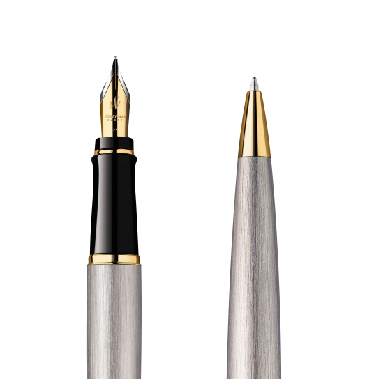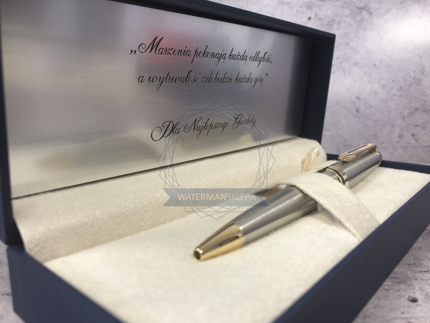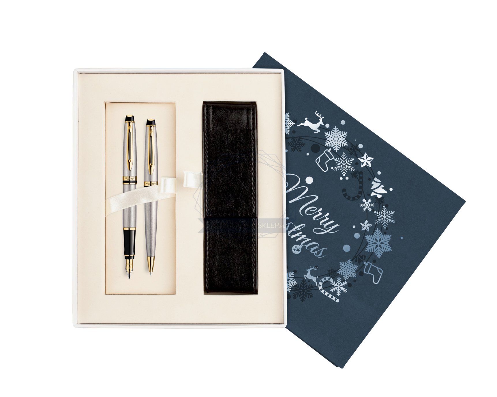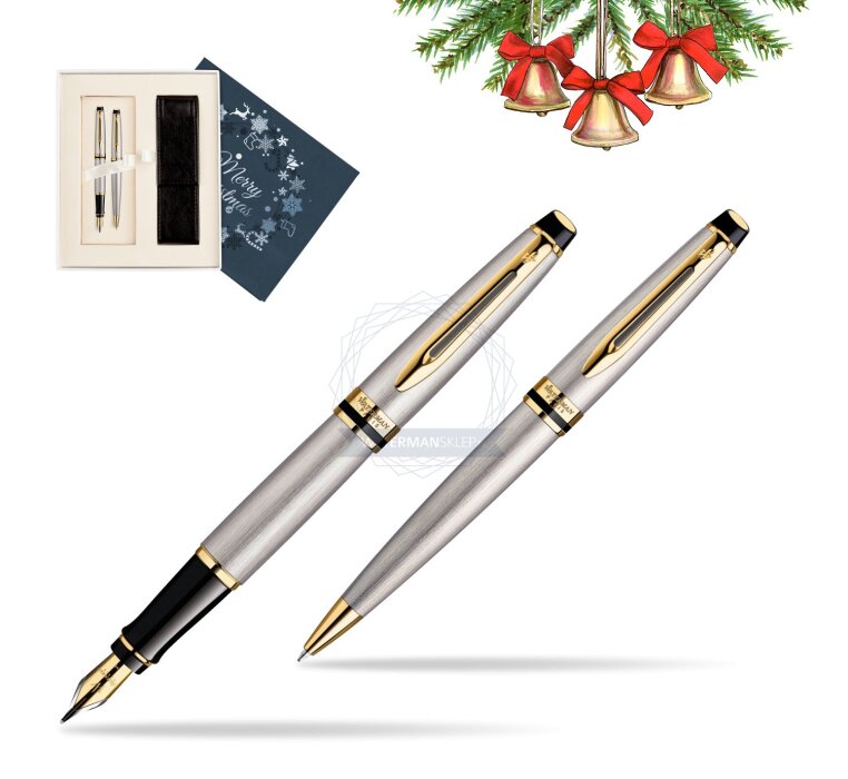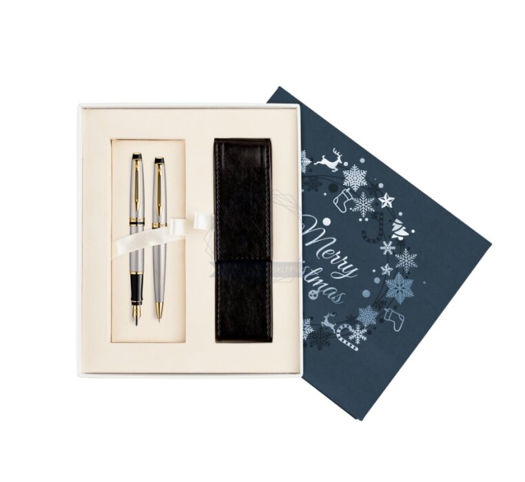 We offer to You Waterman special gift box which contains Waterman Expert Stainless Steel GT Fountain pen + Waterman Expert Stainless Steel GT Ballpoint Pe. Expert brings smart Parisian styling to your business day. With its generous cigar-shaped silhouette and wealth of fine materials, it reveals that beneath your executive persona stirs a creative spirit. Let your vision and flair shine in your professional life with classic Waterman panache. Clients and colleagues will know you by your taste for sophistication. Assertive lines lend a traditional feel to this contemporary classic. The collection features a generous choice of colours and finishes including rich deep lacquers and fine engraving. Brushed steel, golden trims... the alchemist's art allies these metals to create an accessory both contemporary and sophisticated. Its smooth curves add suppleness to your handwriting. As generous as it is sophisticated, this finely gold plated stainless steel nib is adorned with the emblematic W for Waterman. Set is ideal as a gift for everyone on all kinds of occasions like birthdays or as a Waterman Christmas gift. This set is perfect for all companies who wants to give Waterman gifts for their employees, partners or investors. Waterman Ballpoint Pen can be refilled with every Waterman Ballpoint refill and Fountain Pen can be refilled with Waterman Ink in bottle or Ink cartridges. This Waterman Ballpoint Pen comes with a Ballpoint refill is in random colour Black or blue and blue Fountain Pen Ink cartridge. Presented in its Waterman special gift box designed for two Waterman products.