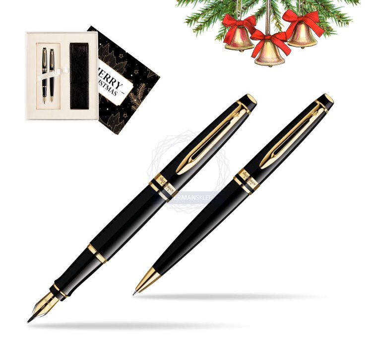 We offer to You Waterman special gift box which contains Waterman Expert Black GT Fountain Pen + Waterman Expert Black GT Fountain Pen Ballpoint Pen. Expert brings smart Parisian styling to your business day. With its generous cigar-shaped silhouette and wealth of fine materials, it reveals that beneath your executive persona stirs a creative spirit. Let your vision and flair shine in your professional life with classic Waterman panache. Clients and colleagues will know you by your taste for sophistication. Assertive lines lend a traditional feel to this contemporary classic. The collection features a generous choice of colours and finishes including rich deep lacquers and fine engraving. Only the discreet golden gleam of its trim competes with the deep black of its lacquer. A powerful, contemporary combination, of timeless elegance. Its smooth curves add suppleness to your handwriting. As generous as it is sophisticated, this finely gold plated stainless steel nib is adorned with the emblematic W for Waterman. Set is ideal as a gift for everyone on all kinds of occasions like birthdays or as a Waterman Christmas gift. This set is perfect for all companies who wants to give Waterman gifts for their employees, partners or investors. Waterman Ballpoint Pen can be refilled with every Waterman Ballpoint refill and Fountain Pen can be refilled with Waterman Ink in bottle or Ink cartridges. This Waterman Ballpoint Pen comes with a Ballpoint refill is in random colour Black or blue and blue Fountain Pen Ink cartridge. Presented in its Waterman special gift box designed for two Waterman products.