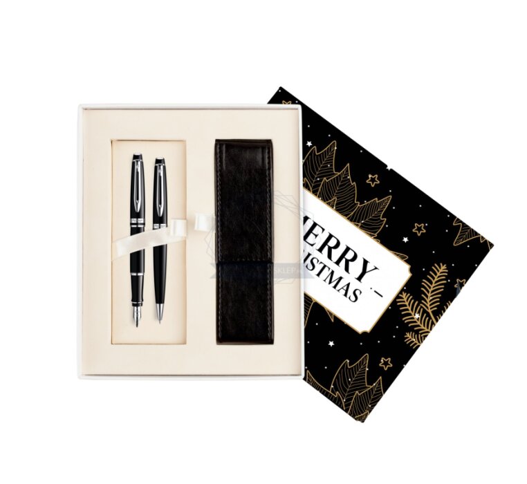 We offer to You Waterman special gift box which contains Waterman Expert Black CT Fountain Pen + Waterman Expert Black CT Ballpoint Pen. Expert brings smart Parisian styling to your business day. With its generous cigar-shaped silhouette and wealth of fine materials, it reveals that beneath your executive persona stirs a creative spirit. Let your vision and flair shine in your professional life with classic Waterman panache. Clients and colleagues will know you by your taste for sophistication. Assertive lines lend a traditional feel to this contemporary classic. The collection features a generous choice of colours and finishes including rich deep lacquers and fine engraving. As contemporary as it is timeless, this accessory associates lacquer of an absolute black with the brilliance of palladium-plated trim. The play between contrasts results in a perfect equilibrium, expressing power and harmony. Made in stainless steel, its nib is both generous and sophisticated. It proudly bears a majestic W, your guarantee of quality and creativity. Set is ideal as a gift for everyone on all kinds of occasions like birthdays or as a Waterman Christmas gift. This set is perfect for all companies who wants to give Waterman gifts for their employees, partners or investors. Waterman Ballpoint Pen can be refilled with every Waterman Ballpoint refill and Fountain Pen can be refilled with Waterman Ink in bottle or Ink cartridges. This Waterman Ballpoint Pen comes with a Ballpoint refill is in random colour Black or blue and blue Fountain Pen Ink cartridge. Presented in its Waterman special gift box designed for two Waterman products.
