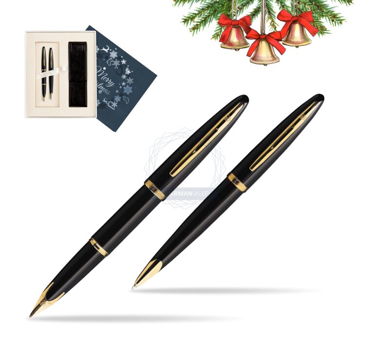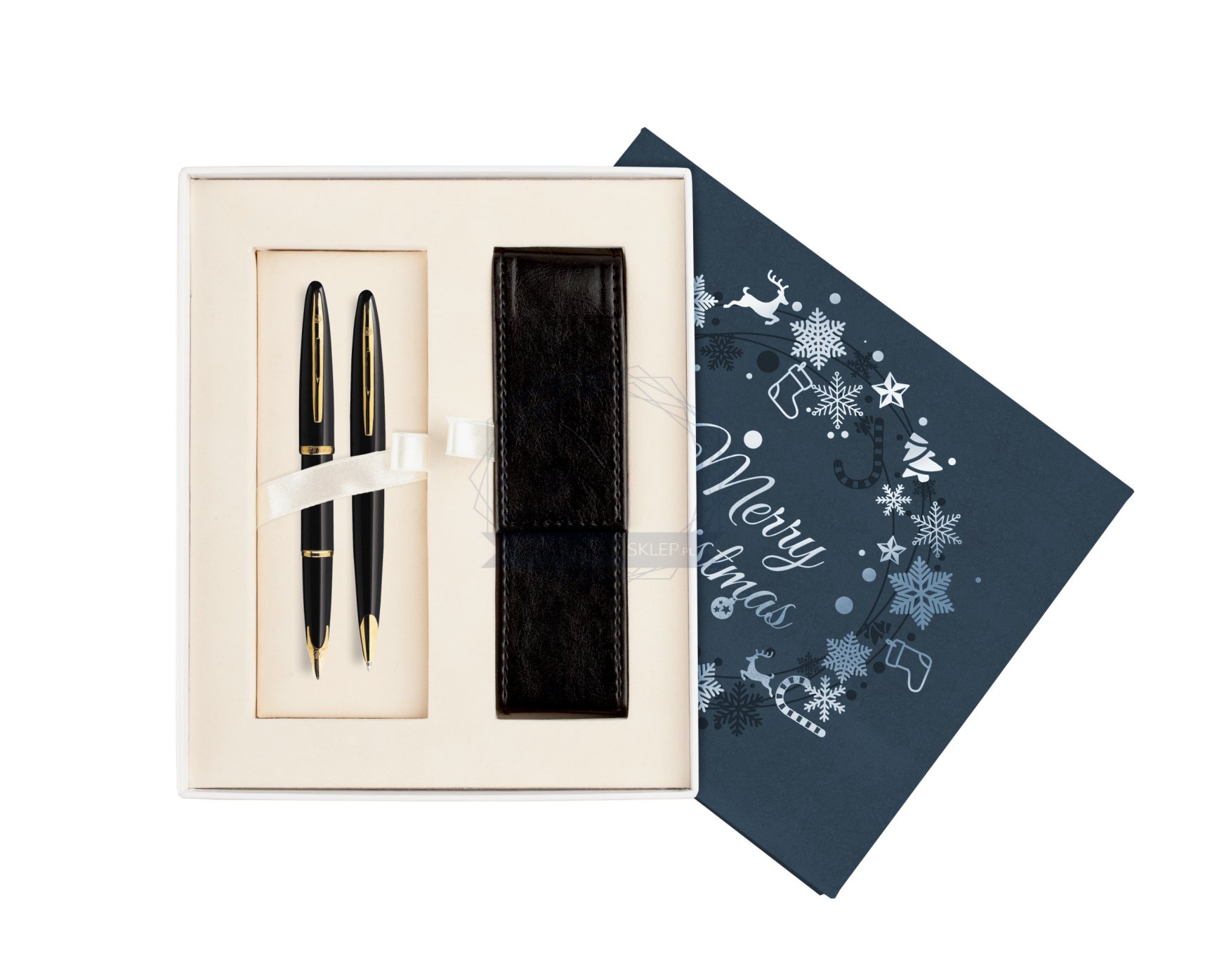 We offer to You Waterman special gift box which contains Waterman Carène Black Sea GT Fountain pen + Waterman Carène Black Sea GT Ballpoint Pen. Carène rides the crest of the innovation wave. Taking inspiration from luxury boat design, the result is our most distinguished example of pioneering vision. Crafted in noble materials, with an artist’s attention to detail, its pure fluid curves conjure up the sleekest lines of a leisure cruiser, or the billowing sails of a luxury yacht. Set sail for the adventure of a lifetime. The streamlined silhouette reflects a determination to achieve absolute purity, notably in the sublimely integrated nib of the fountain pen version. A striking combination of high-gloss black lacquer and rich 24K golden trims produces the classic expression of refined sophistication. Like a plunging bow navigating the infinite possibilities of a pure white page, this rhodium-plated 18K solid gold nib is a unique WATERMAN design. Set is ideal as a gift for everyone on all kinds of occasions like birthdays or as a Waterman Christmas gift. This set is perfect for all companies who wants to give Waterman gifts for their employees, partners or investors. Waterman Ballpoint Pen can be refilled with every Waterman Ballpoint refill and Fountain Pen can be refilled with Waterman Ink in bottle or Ink cartridges. This Waterman Ballpoint Pen comes with a Ballpoint refill is in random colour Black or blue and blue Fountain Pen Ink cartridge. Presented in its Waterman special gift box designed for two Waterman products.