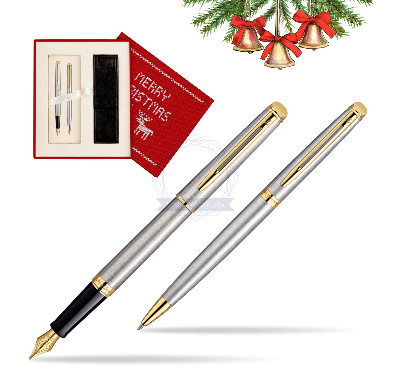We offer to You Waterman special gift box which contains Waterman Hémisphère Stainless Steel GT Fountain pen + Waterman Hémisphère Stainless Steel GT Ballpoint Pen. Hémisphère makes each moment refreshingly elegant. In the spirit of Waterman innovation, it redefines timeless lines with a new focus on streamlined simplicity. Striking clean design and noble materials come together for a delightful writing experience to inspire your most creative thoughts. Everything flows from the elegant slim shape. Features a dynamic combination of elements like the slim clip and broad ring, to enhance the distinctively narrow form. Mixing metals for an anytime accessory, brushed solid stainless steel and 23 K golden trims, in a classic composition of smooth discerning style. Comfortable and brilliantly designed, the expertly engraved nib is unmistakable in its writing experience. Set is ideal as a gift for everyone on all kinds of occasions like birthdays or as a Waterman Christmas gift. This set is perfect for all companies who wants to give Waterman gifts for their employees, partners or investors. Waterman Ballpoint Pen can be refilled with every Waterman Ballpoint refill and Fountain Pen can be refilled with Waterman Ink in bottle or Ink cartridges. This Waterman Ballpoint Pen comes with a Ballpoint refill is in random colour Black or blue and blue Fountain Pen Ink cartridge. Presented in its Waterman special gift box designed for two Waterman products.