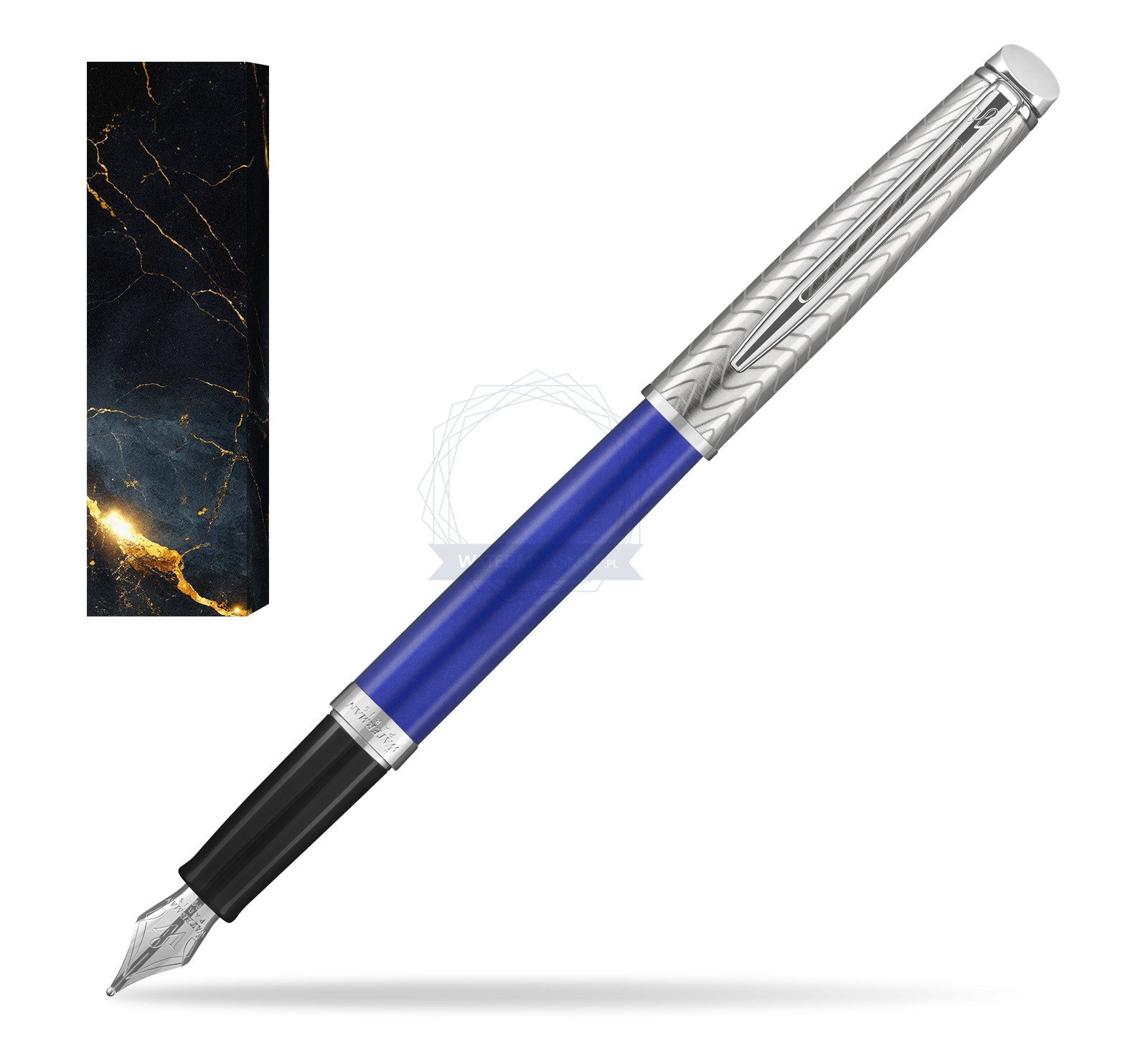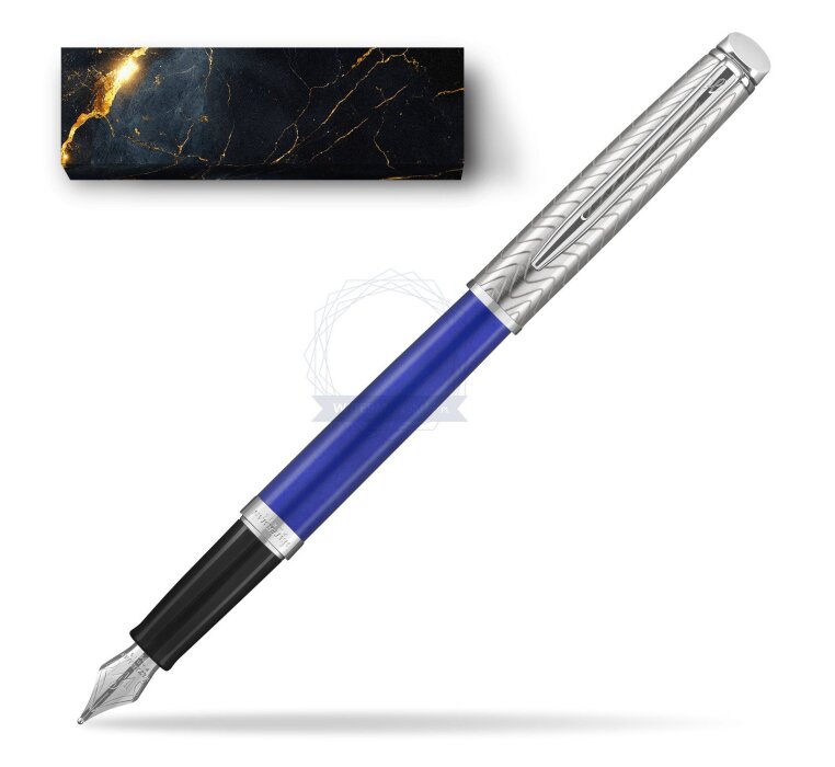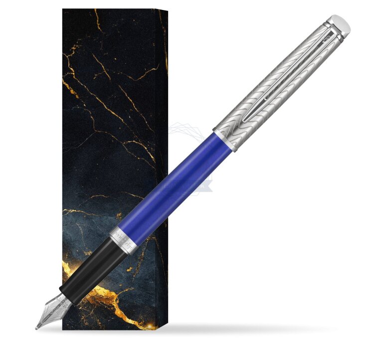 Hémisphère makes each moment refreshingly elegant. In the spirit of Waterman innovation, it redefines timeless lines with a new focus on streamlined simplicity. Striking clean design and noble materials come together for a delightful writing experience to inspire your most creative thoughts. The Finish A vibrant blue lacquer finish complete with intricate signature pattern etched onto the pen. The Nib: Comfortable and brilliantly designed, the expertly engraved nib is unmistakable in its writing experience. The Clip Palladium finish. This Waterman Fountain Pen can be refilled with every Waterman Ink cartridges or by Waterman Ink in bottle. This Waterman Fountain Pen comes with nib size F. One ink cartridge included in random blue or black colour.