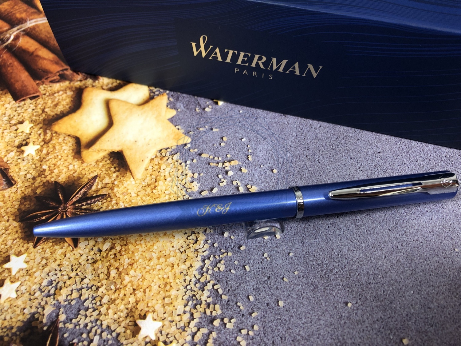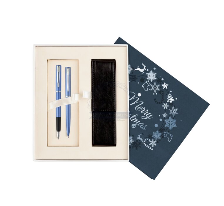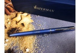 Fountain Pen Modern and elegant Waterman fountain pen. Available now at a great price. The fountain pen is covered with a tasteful blue lacquer with a matte shade. The clip and ring are made of stainless steel and covered with shiny chrome. The nib was made of stainless steel. A Waterman engraving on the surface of the nib. The pen can be loaded with the attached cartridge. It is also compatible with the standard Waterman plunger Ink color: blue The product is sold in an elegant blue Waterman box Ballpoint Pen Very modern and elegant ballpoint at an excellent price. The pen is covered with a tasteful blue varnish. The clip and ring are made of stainless steel and covered with shiny chrome. It has a push mechanism for ejecting the cartridge (we press the entire tip) Ink color: blue The product is sold in an elegant blue Waterman box