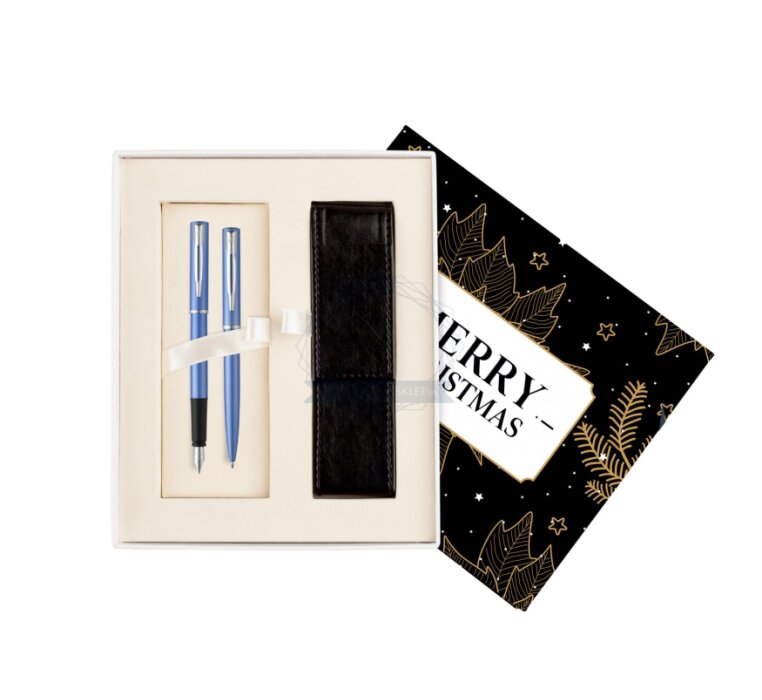 Fountain Pen Modern and elegant Waterman fountain pen. Available now at a great price. The fountain pen is covered with a tasteful blue lacquer with a matte shade. The clip and ring are made of stainless steel and covered with shiny chrome. The nib was made of stainless steel. A Waterman engraving on the surface of the nib. The pen can be loaded with the attached cartridge. It is also compatible with the standard Waterman plunger Ink color: blue The product is sold in an elegant blue Waterman box Ballpoint Pen Very modern and elegant ballpoint at an excellent price. The pen is covered with a tasteful blue varnish. The clip and ring are made of stainless steel and covered with shiny chrome. It has a push mechanism for ejecting the cartridge (we press the entire tip) Ink color: blue The product is sold in an elegant blue Waterman box