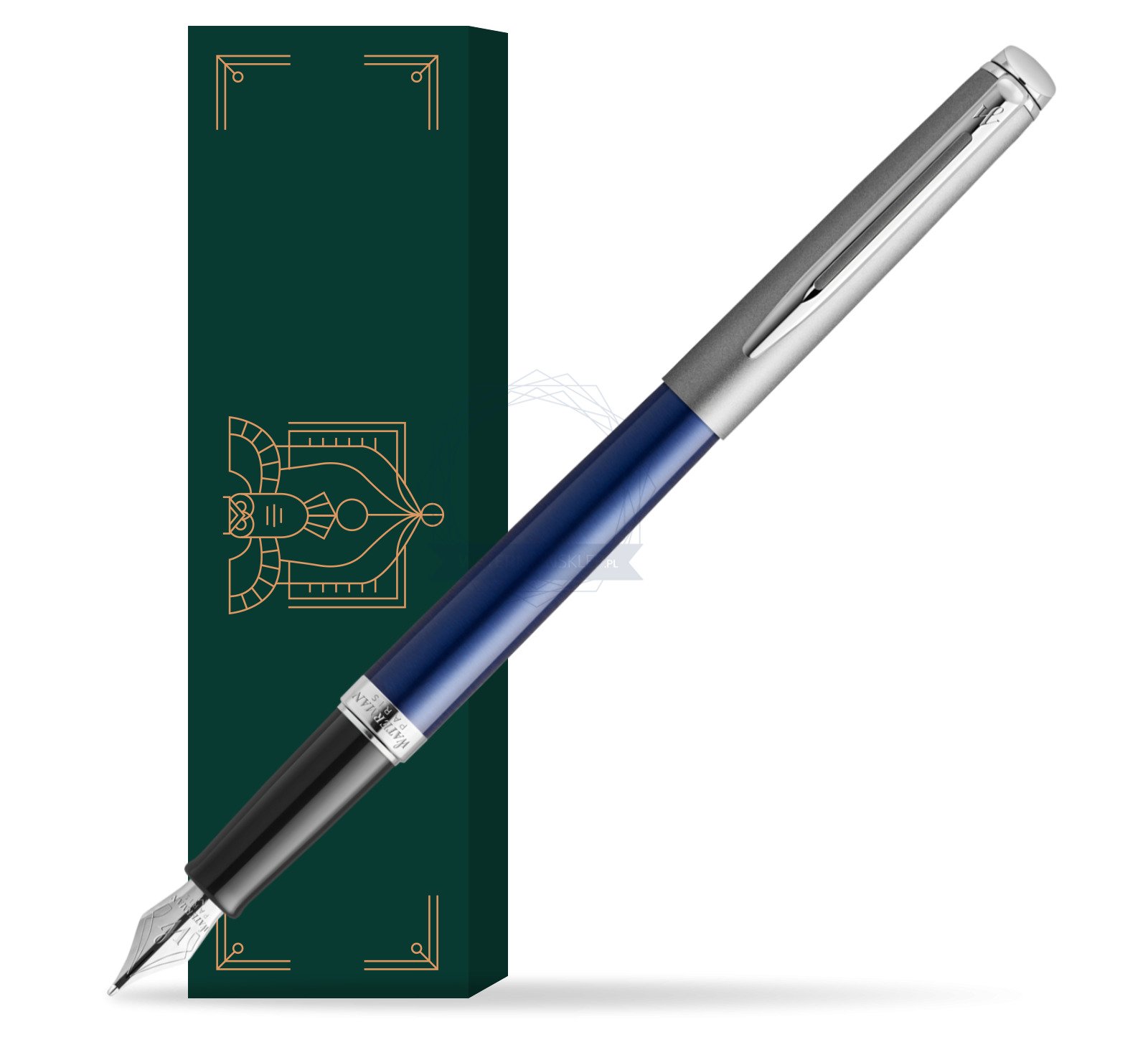 Waterman Hémisphère Fountain Pen, stainless steel and blue matte lacquer with chrome finishing, nib, blue ink cartridge, gift box.