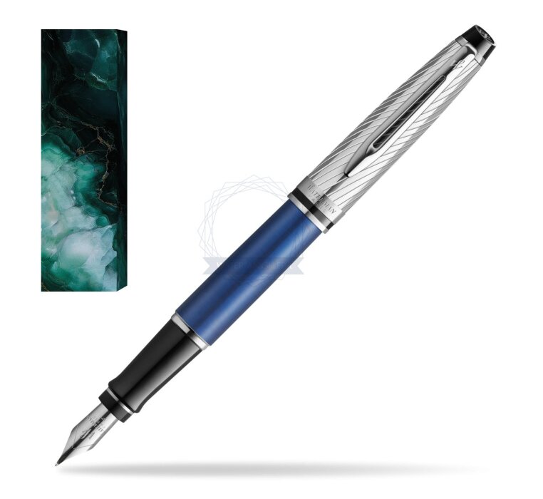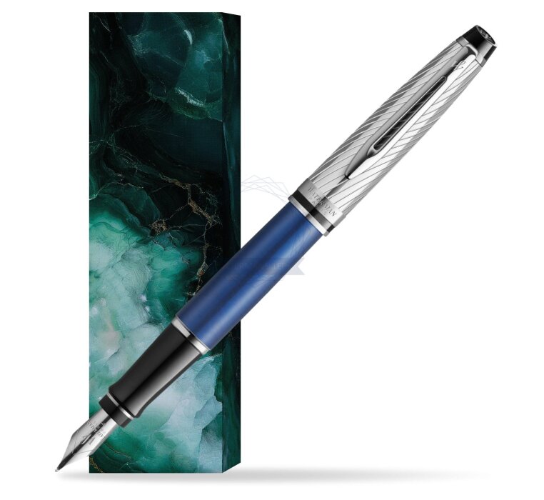 The Expert Deluxe Blue fountain pen offers ease of writing and allows you to express your lofty ambitions and exceptional taste. The tapered barrel shape and the contoured stripe pattern engraved on the cap, inspired by timeless, elegant men's fashion, add French chic, confidence and authority to any writing occasion. The unique lacquered barrel in metallic blue, the distinctive Waterman split clip and the faceted cap form a coherent whole with the elegant "W" logo on the stainless steel nib. Expert Deluxe Collection – A symbol of ambition.